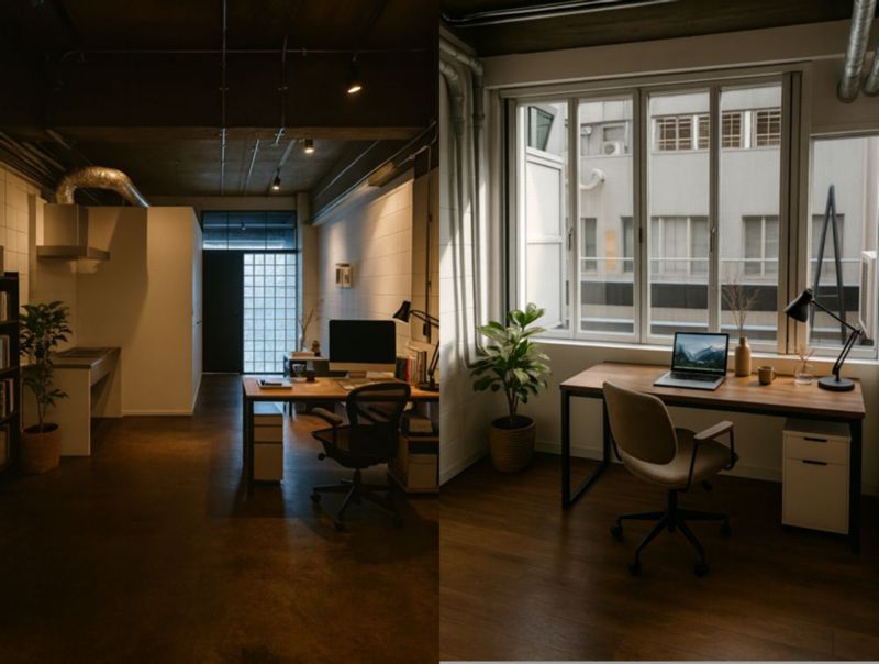 横浜駅徒歩圏内・西区平沼のリノベーション空間。38㎡の元事務所を住居やSOHO対応に刷新し、柔らかな床材とコンクリート現し天井が無骨さと温もりを演出。梁や斜め壁が奥行きを生み、ギャラリーのような空気感を漂わせる都市型デザインです。