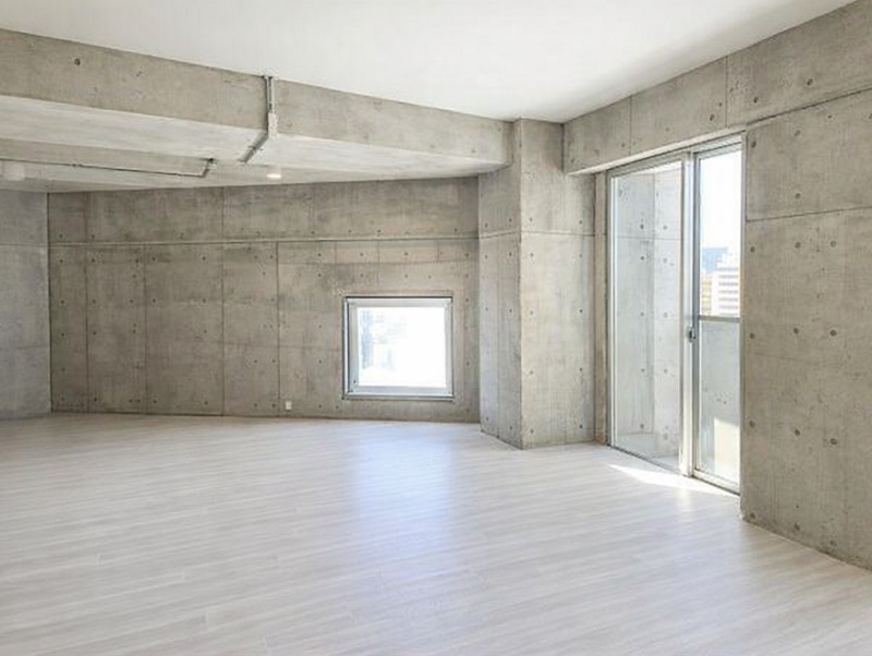 コンクリートとタイルの床に、壁面・天井もコンクリート打ち放しのハード&クールなイメージのお部屋です。