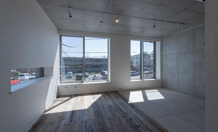 コンクリート打放しの外観と大開口が印象的な目黒区青葉台の集合住宅。光が差し込む無垢床と白壁の室内は、広々とした自由度の高い空間構成が魅力。SOHOやアトリエにも対応し、都市生活者に柔軟で上質な暮らしを提案します。