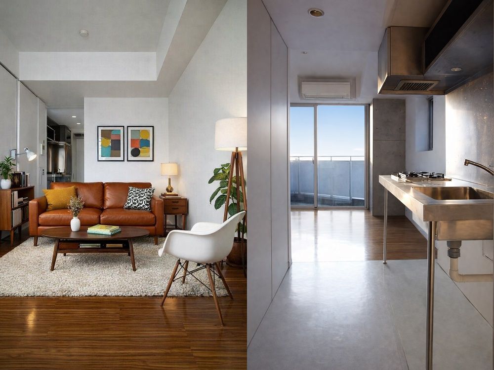 コンクリート打放しとタイルの外観が美しい大田区西六郷のデザイナーズマンションのワンルーム。中央に配したガラスブロックのトイレが光を取り込み、回遊する空間を生み出します。