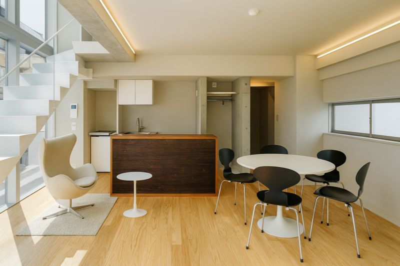 目黒駅徒歩6分、白い外観が印象的なデザイナーズマンション。チンクエ・テルレを着想源にした都市の“集落”のような集合住宅です。2~3階のメゾネット1LDKは大開口から光が満ち、眺望も良好。住居はもちろんSOHO利用にも適した開放的な空間です。