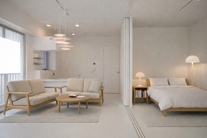 ワンフロアを贅沢に使った室内空間は、必要に合わせて可動式収納棚や家具によってフレキシブルに間取りを変える事ができます。