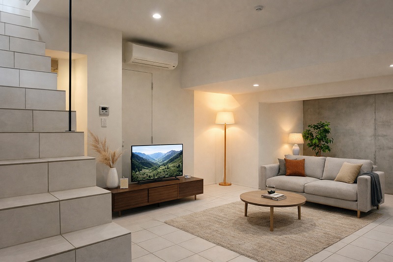 代々木八幡・代々木公園エリア、元代々木町に建つスタイリッシュなデザイナーズ。1階と地下階で構成された57.88㎡のメゾネット1LDKで、SOHO利用も可能(登記不可)。上下階で空間を分けられるため、住まいと仕事をゆるやかに両立できる住まいです。