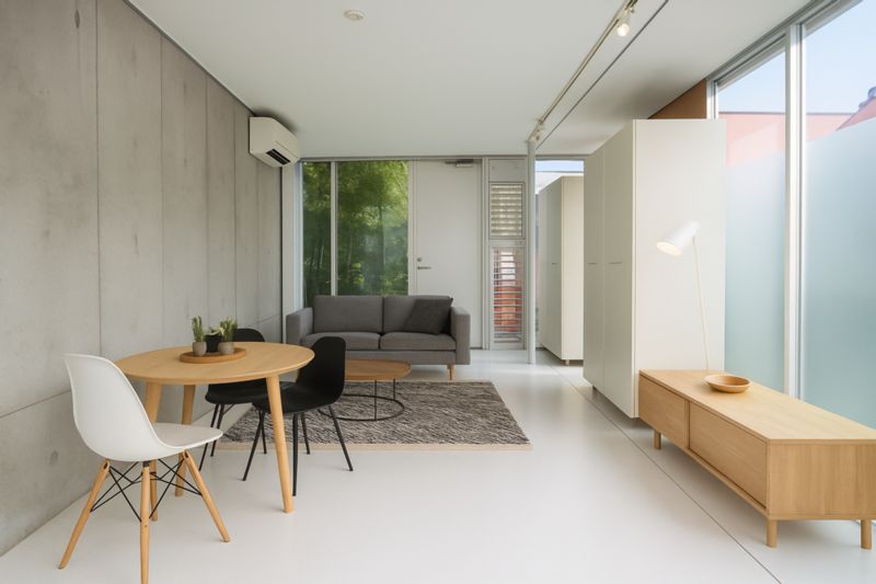 室内は、美しい緑の中庭を眺めながらガラスボックスのユニット内をぐるりと回廊できるプラン。