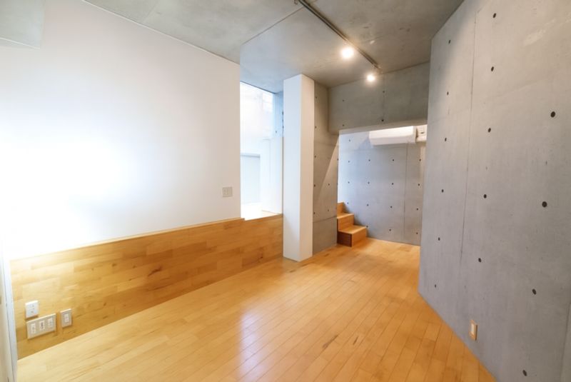 3.5mほどのロフト付きの高い天井とコンクリートと建具などに多用された木材が特徴のイメージです。