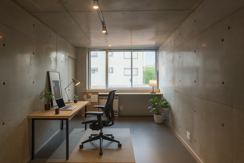 当室は1階の42㎡弱ほどのワンフロアでSOHO利用に適した1kプラン。