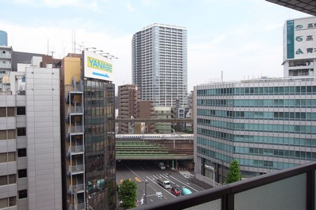 まさに都会のど真ん中の物件で、建物の前は大通り、バルコニーから外を眺めると新幹線やモノレールの高架線路も走っています。