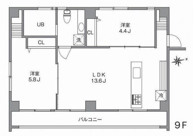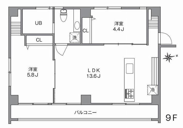 13.6帖のリビングとつながる5.8帖の洋室、そして4.4帖の和モダンな1室からなる2LDKプラン。