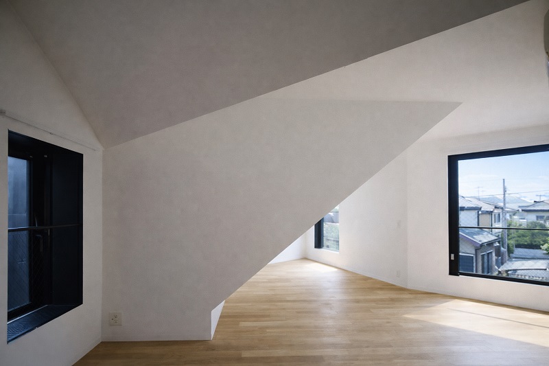 室内には屋根形状や斜めに現れる階段、壁の凹凸がダイレクトに表れ、空間に独特の歪みと奥行きをもたらします。