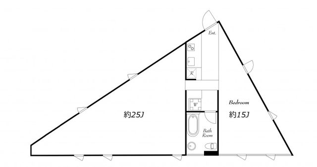 建物の2階に位置する1LDKタイプの当室は、トライアングルのような三角形の形状をしたリビングと個室、そしてバスルームからなる88.41㎡のお部屋です。
