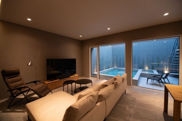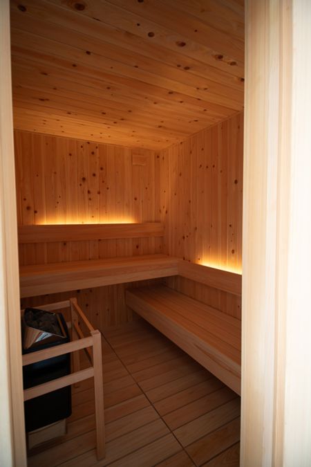 その内側には温水プール、露天風呂、そしてロウリュ可能な檜サウナを備えた贅沢なプライベートリゾートが広がる。