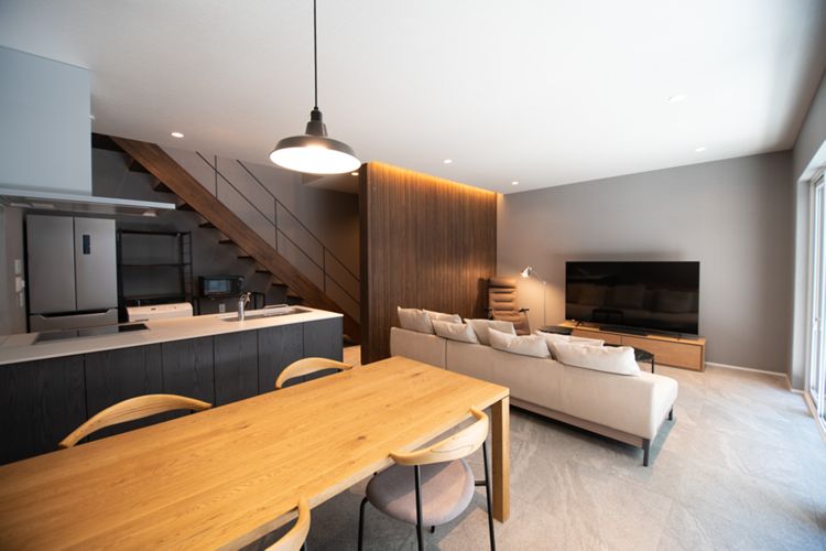 インテリアはシンプルで落ち着いたトーンを基調としつつ、無垢材の家具や間接照明が居住空間に温かみを添える。