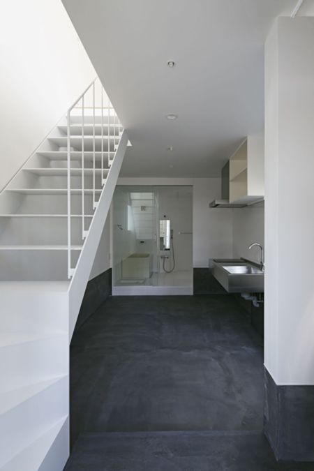 室内は1階にグレーの左官仕上げの床とステンレスキッチン、ガラス越しに広がるバスルームが印象的。