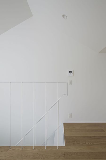 2階は勾配天井の開放的な空間に無垢フローリングを敷き、白壁と木の温かみが調和するシンプルで上質な雰囲気です。