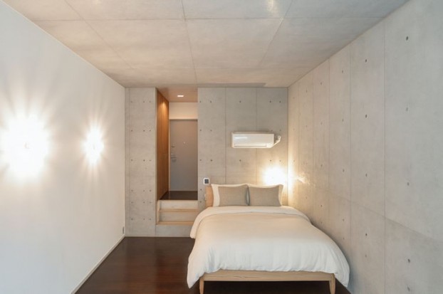 シンプルな長方形の間取りは家具配置の自由度が高く、濃色フローリングとRC打放しの壁が重厚感を演出しています。