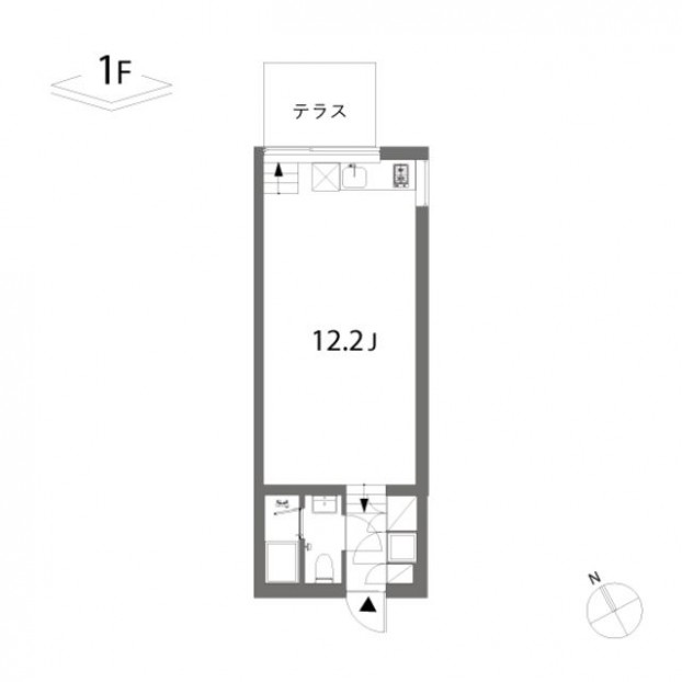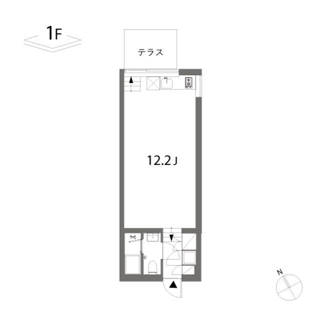当室は1階のワンルームプラン。室内は玄関側に水回りを集約し、3段のレベル差を下った先に12.2帖のワンルームと専用テラスが広がります。