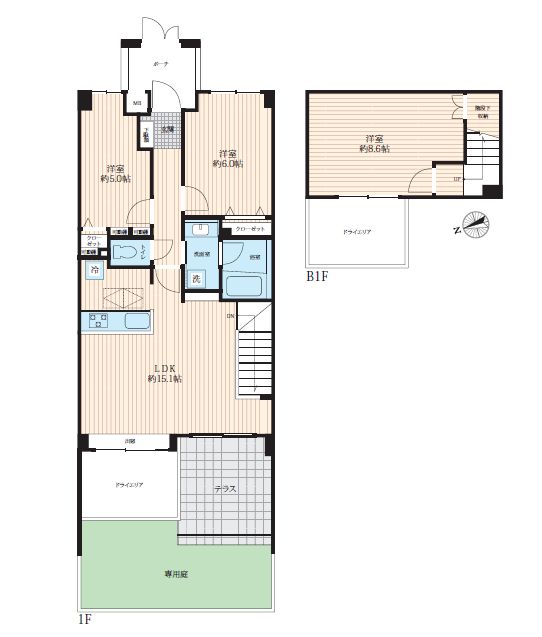 ご紹介する当室は、地下1階+1階のメゾネット住戸で、60.36㎡の2層空間を活かした開放感あるプラン。