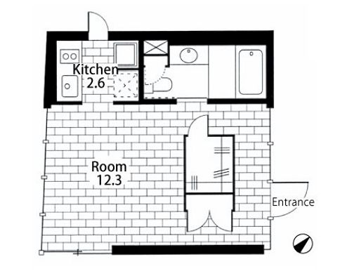 当室は、1階32㎡のコンパクトなワンフロア。煉瓦タイル床と白壁の内装に、木箱型収納と木製ブラインドを備えた少人数でのSOHO・オフィスに向いたミニマル空間です。