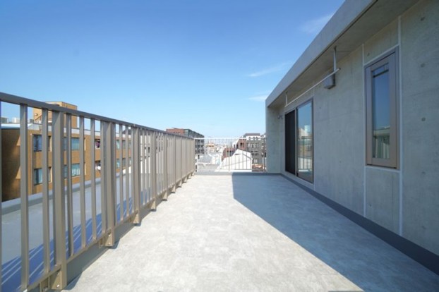 最上階ペントハウス(3–4階メゾネット)にはウッドデッキ敷きの専用ルーフバルコニーを完備。