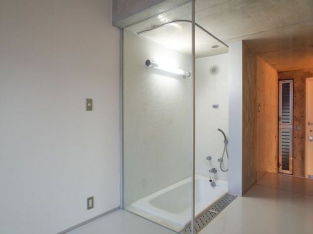 浴室はガラス張りで開放感があり、限られた面積を最大限に活かした設計が施されています。機能性とデザイン性の両方を楽しみたい方におすすめの一室です。