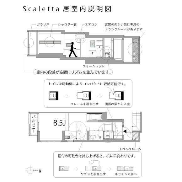 折りたたみ式のキッチン作業台や引き出し式のトイレ扉など、暮らしの中に小さな驚きを感じられます。
