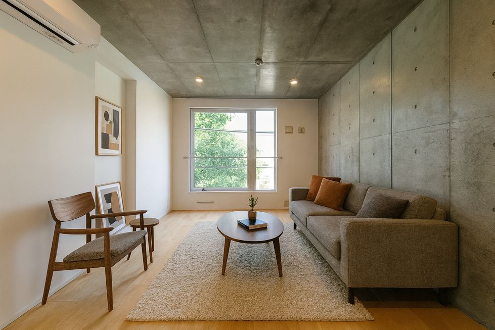 コンクリートの質感と白の清潔感、そして木のぬくもりが調和したセンスあるデザインのお部屋です。