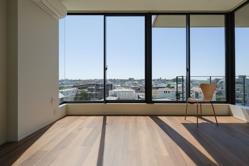 6階2LDKの室内はコンクリートの構造美と光が交差する開放的な空間。窓の向こうに広がる抜ける眺望が、日常に静かな贅沢をもたらします。