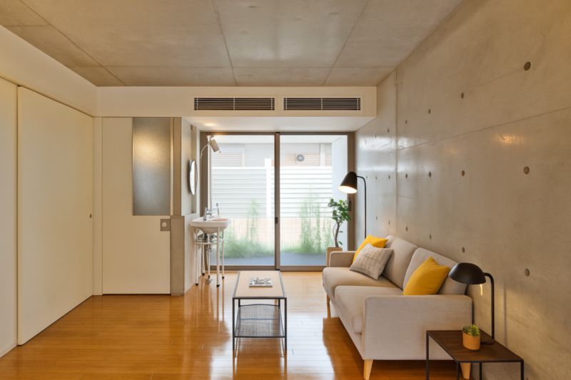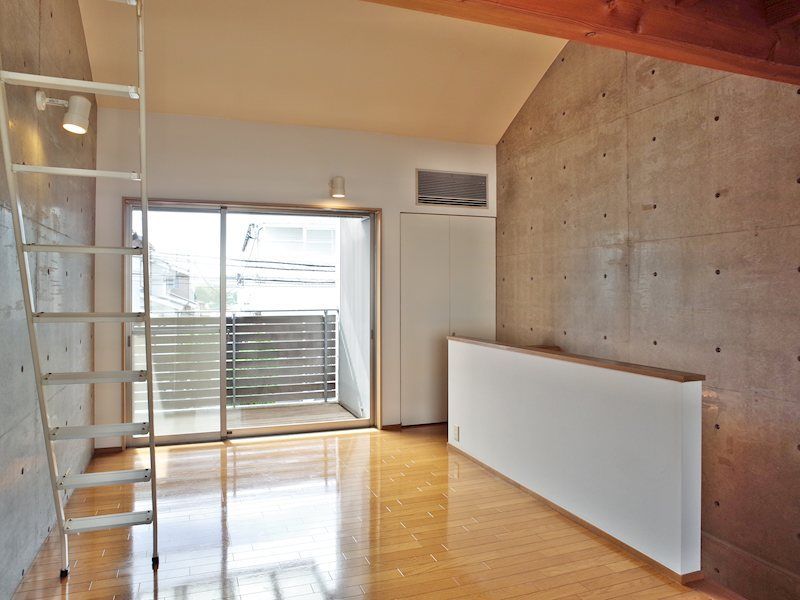 コンクリート打ち放しの壁と木のフローリングが織りなす空間は、現代的でありながらどこか懐かしい温もりを感じさせます。