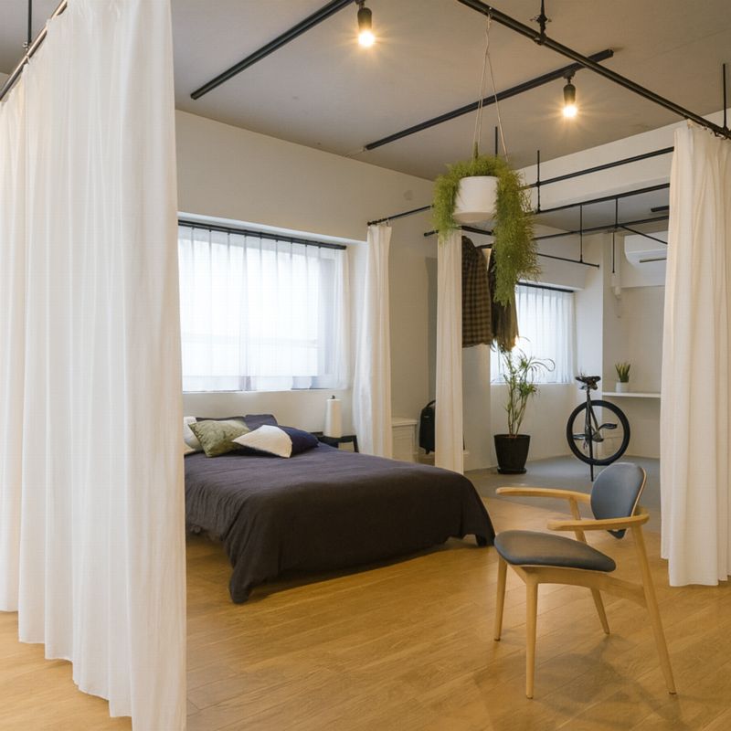 ワンフロアを贅沢に使った32.9畳の室内は、仕切りに縛られない“ひとつながりの大きな部屋”。玄関から続くゆったりとした土間は、アトリエやワークスペース、自転車やアウトドアギアの置き場としても自在に使える。室内に張り巡らせたパイプレールと白いカーテンは、緩やかに空間をゾーニングし、目的に合わせて表情を変える。住まい手の感性をそのまま受け入れる、ニュートラルな器だ。