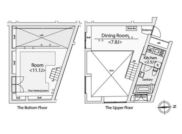 下吹越武人氏/A.A.E設計。五角形平面により全戸角部屋を実現した恵比寿の集合住宅。当室は1階47.66㎡の1DKスキップフロア。立体的な構成と多様な窓辺が暮らしに奥行きを与えます。