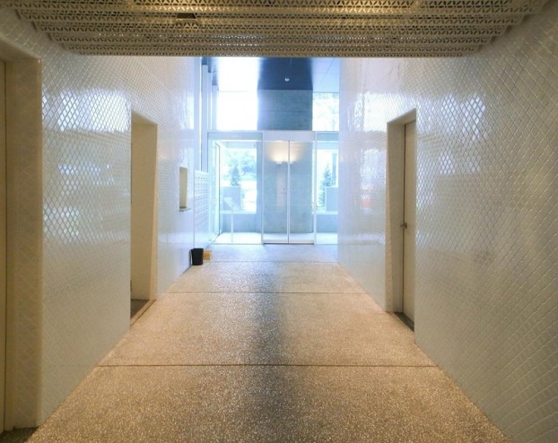基礎免震構造に加え、PRCによるフラットな床スラブと12m角の無柱空間を採用。乾式耐火間仕切による自由度の高い住戸計画や、全住戸の約4分の3がコーナーユニットという開放性も魅力です。
