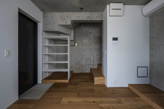 キッチンと居室を上下階に分け、ダイニングキッチンから寝室、バスルームへと緩やかにつながるステップフロア構成により、コンパクトながらも立体的で奥行きを感じられる住空間となっています。