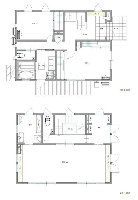 2階に開放的なLDKを配し、1階には洋室2室とバスルームを配置した機能的なプランです。
