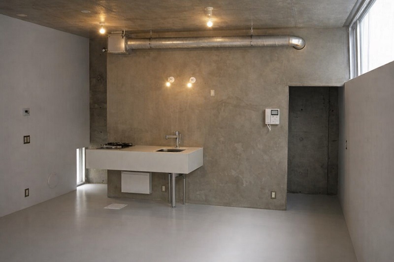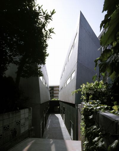 共通のアプローチを抜けて入る長屋式の建物は、コンクリート打ち放しのシャープな外観が印象的。