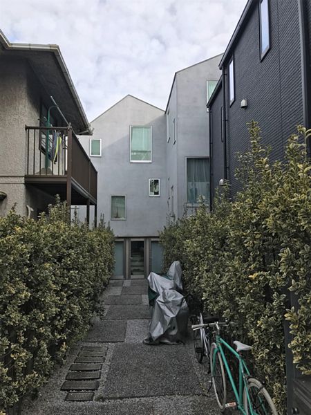 通りから植栽のアプローチの先に建つ木造3階建ての当物件。