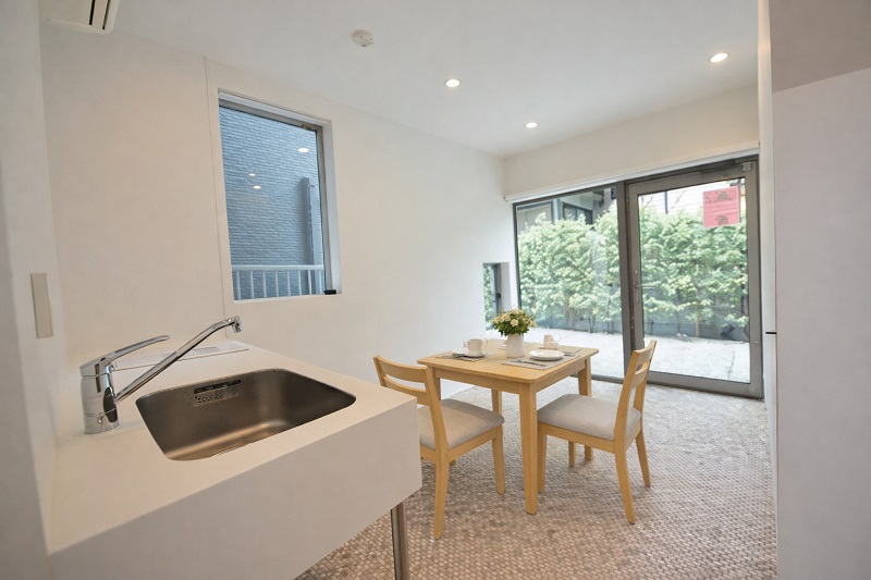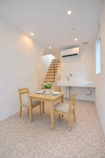 キッチンのあるお部屋で、バスルーム、トイレが置かれ、ワークスペースのような佇まいを見せています。