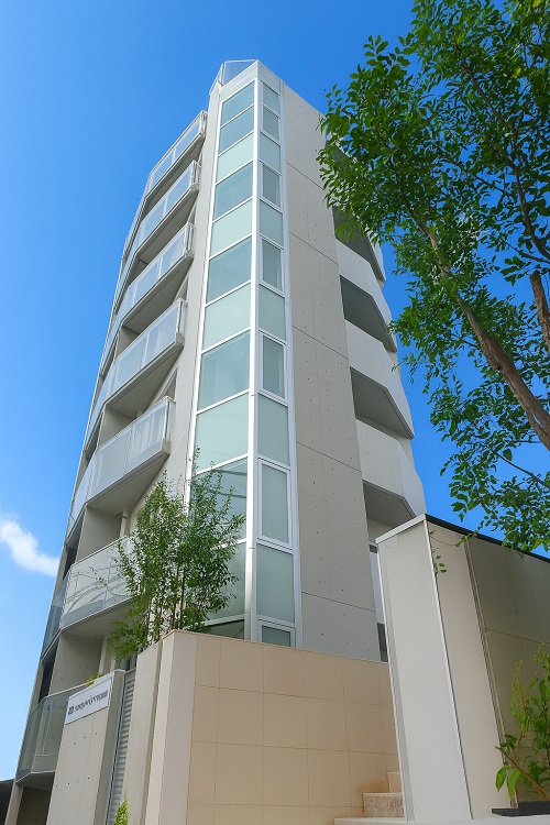 地上8階建ての外観は、シャープな印象のコンクリート打ち放し。エントランスから居室までのアプローチを光のアクセントでドラマティックに演出しています。